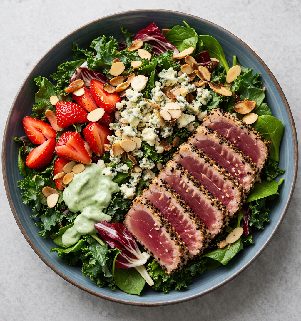 🍓 4) Seared Ahi Power Salad with Strawberry, Almond & Gorgonzola